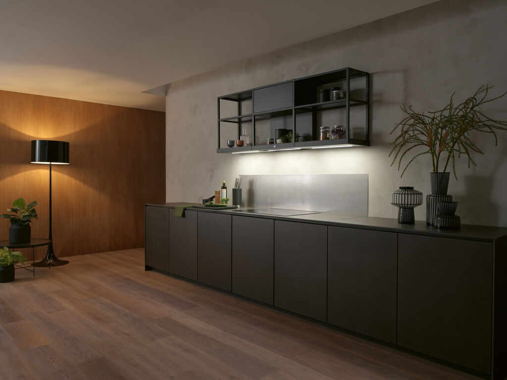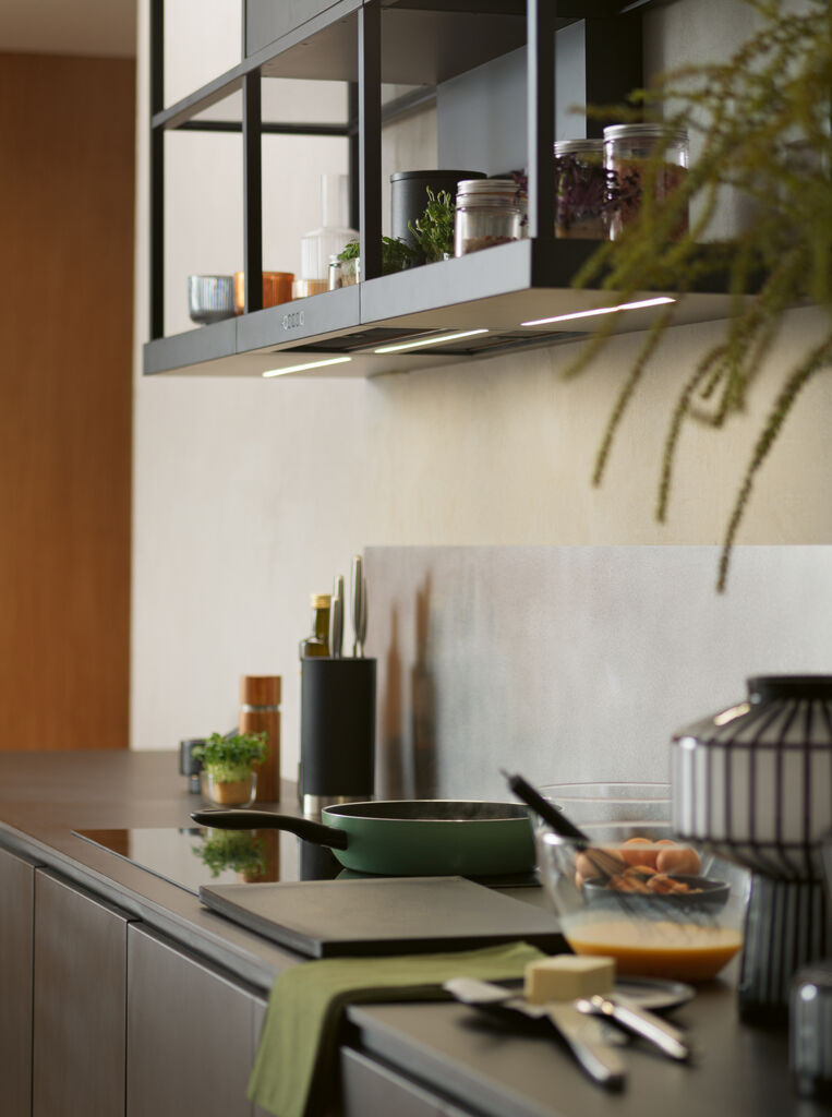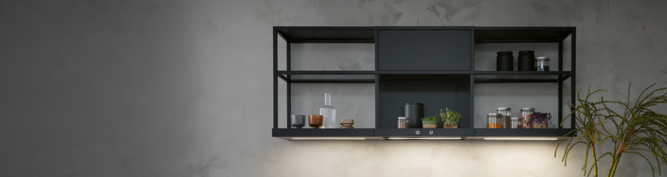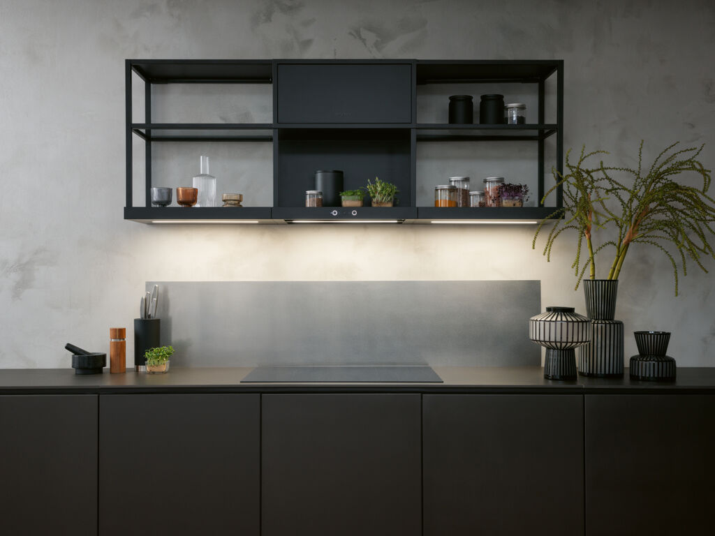 Der Motor unserer Haube ist im oberen Teil des Gerätes untergebracht, wodurch der mittlere Bereich optimal als Organisationsraum genutzt werden kann und in dieser Bauweise sogar mit bis zu zwei Zusatzmodulen erweiterbar ist. Die Bedienelemente befinden sich unten und schließen bündig mit der Oberfläche ab, was für ein aufgeräumtes Erscheinungsbild sorgt. Im unteren Bereich der Haube ist ein schlanker LED-Lichtstreifen zentral platziert, der sowohl die Arbeitsfläche gezielt beleuchtet als auch eine angenehme Lichtstimmung schafft. Zudem ist Modular flexibel konfigurierbar – von der Einzellösung bis zur komplett ausgestatteten Variante mit seitlichen Modulen. Insgesamt entstand mit durchdachten Details ein ebenso funktionales wie ästhetisches Gesamtkonzept.