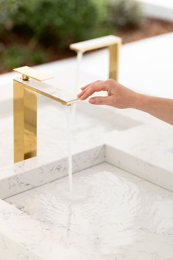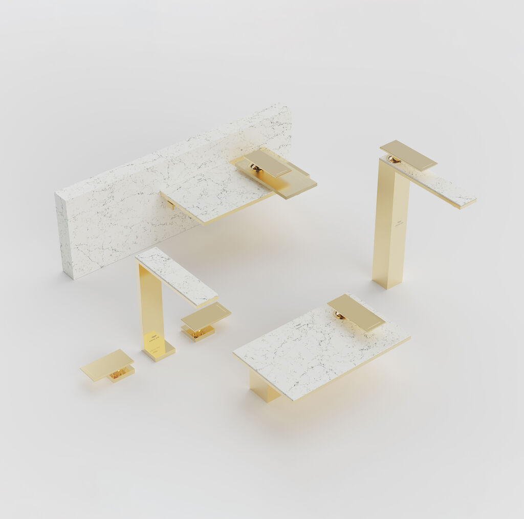 Ziel war es, eine Premium-Badarmaturenserie zu entwerfen, die ein kühnes Designstatement setzt und gleichzeitig unbegrenzte Möglichkeiten zur Individualisierung bietet: Austauschbare Platten und die Verwendung von Materialien wie Caesarstone, Glas und Spiegelglas erlauben im Einklang mit den Erwartungen der Konsumenten eine vollständige Individualisierung.