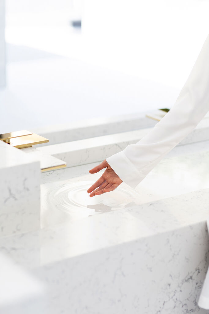 Wir haben einen ganzheitlichen Ansatz verfolgt, bei dem Form und Funktion gleichermaßen im Vordergrund standen. Optisch erzeugen die geometrische Silhouette und die schwebende Anmutung der Oberflächen eine moderne, elegante Ästhetik. Gleichzeitig wurde die technische Konstruktion so konzipiert, dass sie diesen raffinierten Look unterstützt – insbesondere durch die austauschbaren Abdeckungen, die eine nahtlose Anpassung ermöglichen, ohne die Funktionalität zu beeinträchtigen. Darüber hinaus zeigen Innovationen wie die integrierte Ablage, die zugleich als Wasserauslauf dient, wie Design und Technologie zu einer intuitiven und eleganten Lösung verschmelzen können.