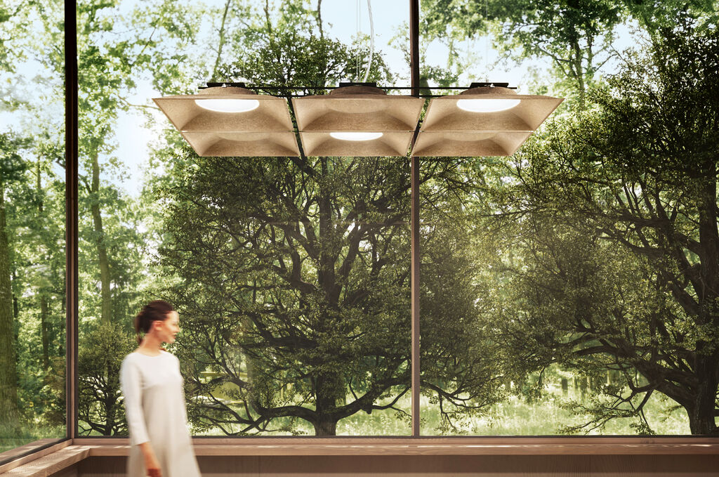 Das Leinenmaterial weckt das Gefühl, mit der Natur verbunden zu sein – mit den einfachen Dingen des Lebens. Es drückt Entschleunigung sowie den Wert von altem, zeitlosem Wissen aus. Diese Naturverbundenheit wird durch die Beleuchtungsfunktion verstärkt, die dem natürlichen Tagesrhythmus folgt. Der biophile Designansatz zielt darauf ab, natürliche Lichtvariationen zu schaffen und damit das Wohlbefinden und die Harmonie im umgebenden Raum zu fördern.