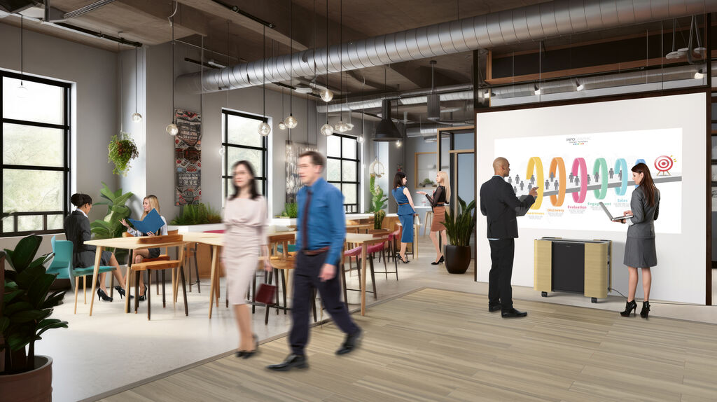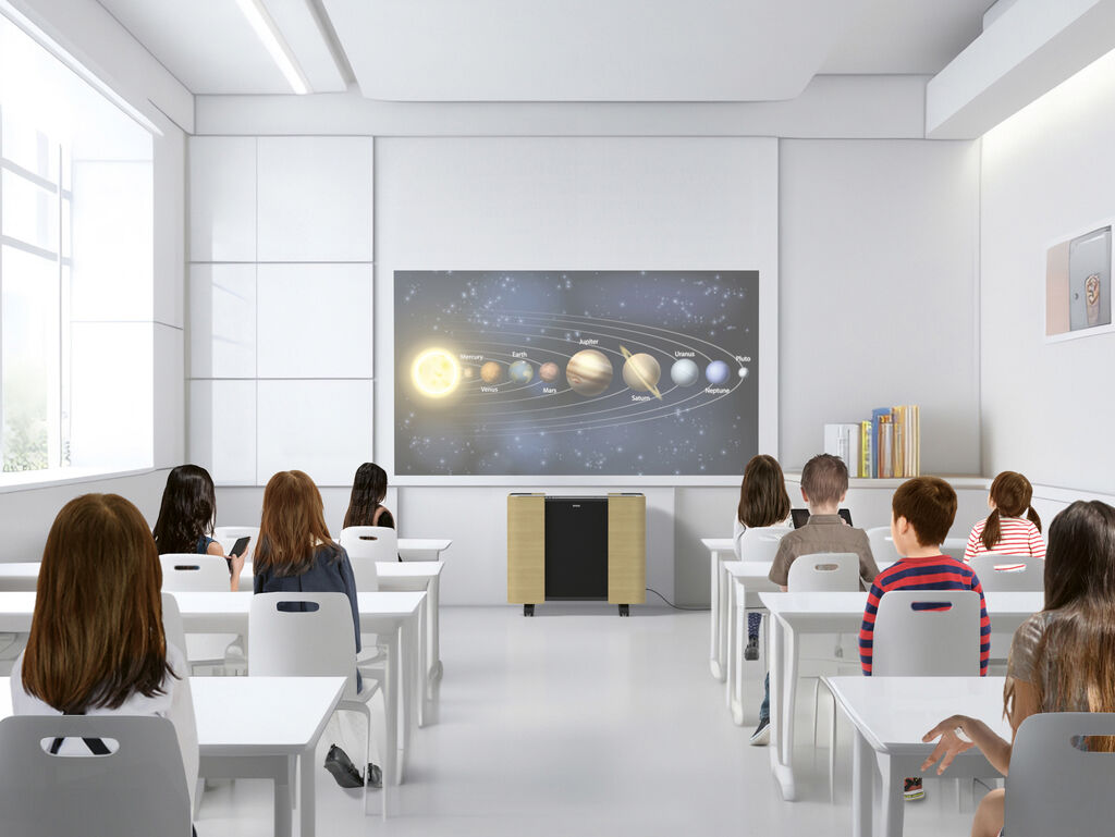 Der wohnliche Charakter war ein sehr wichtiges Designziel. Zu den vorgesehenen Anwendungsszenarien gehören Unternehmensbüros und Bildungsumgebungen. Wir mussten ein hohes Maß an Ausgewogenheit zwischen der Funktion der Mobilität – der Möglichkeit, den Projektor und den Lautsprecher zu bewegen – und der eleganten Präsenz erreichen, die das Produkt an seinem vorgesehenen Standort haben sollte. Die Paneele mit Holzmaserung wurden sowohl zum Schutz des Hauptgeräts als auch zur Erfüllung der Anforderungen an eine wohnraumfreundliche Ästhetik gewählt.