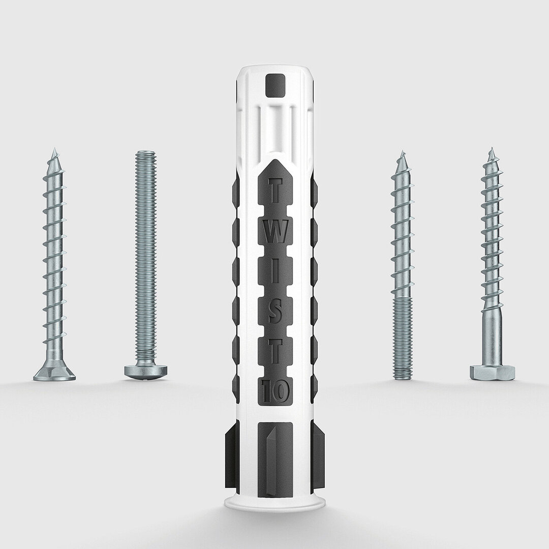 Einfach gesetzt, 8-fach verknotet. Der innovative Allzweckdübel Shark® Twist von Würth kann problemlos ganz ohne Hammer mit den Fingern bündig ins Bohrloch gesetzt werden. Das Eindrehen der Schraube gelingt leicht und ohne Überdrehen. Der Zwei-Komponenten-Kunststoff-Allzweckdübel passt sich den Baustoffen an.