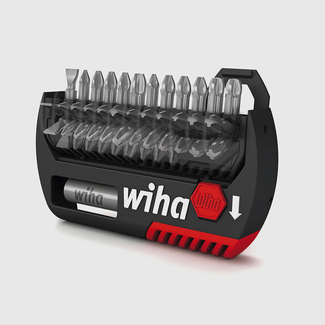 Der Bit Box FlipSelector von Wiha ist eine Bitbox, die je nach Anwendungsgebiet bestückt werden kann. Wenn die rote Logo-Taste nach unten geschoben wird, schwenkt das Bit-Klemmelement um 180 Grad nach außen und gibt die Bits zur Entnahme frei.
