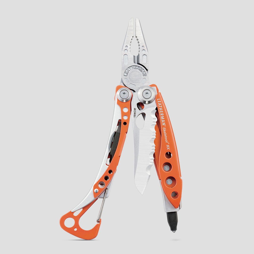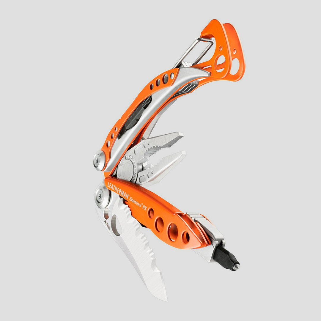 Die einzelnen Werkzeuge des Leatherman Skeletool RX für den Rettungseinsatz sind von allen Seiten hervorragend einsehbar und sinnvoll angeordnet. Es verfügt über einen Glasbrecher und eine extra starke feststellbare Kombiklinge für harte Materialien wie Leder oder Canvas. Weiterhin gehören eine normale und eine Spitzzange, Drahtschneider, Schraubendreher und Bithalter inkl. Kreuzschlitzschraubendreher zur Ausstattung. So hat man das richtige Werkzeug stets schnell zur Hand.
