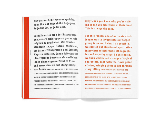 Das Design zielt darauf ab, die Botschaft zu vermitteln, dass das Unternehmen einen mutigen Paradigmenwechsel vollzogen hat. Es wurde vom Hersteller emaillierter Grillgeräte zum authentischen Anbieter von Produkten, die für gutes Essen, Qualität und gemeinsamen Outdoor-Genuss stehen. Die hochwertige Publikation zeigt den Weg vom Werkzeug zum Lifestyle-Gerät. Der offene Buchrücken in Signalfarben fällt ins Auge und wertet sie optisch auf.