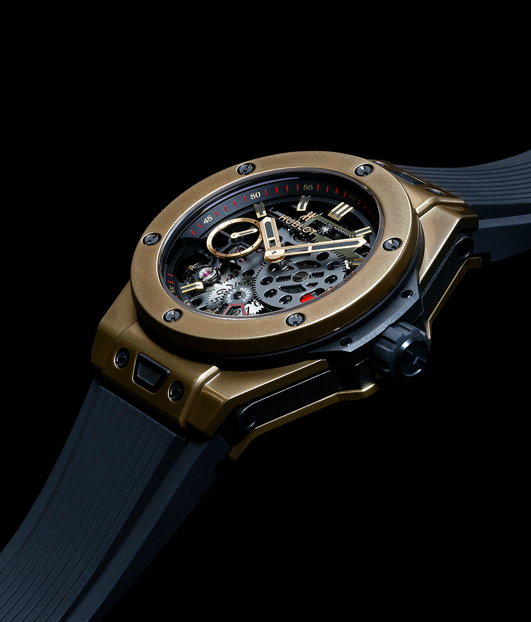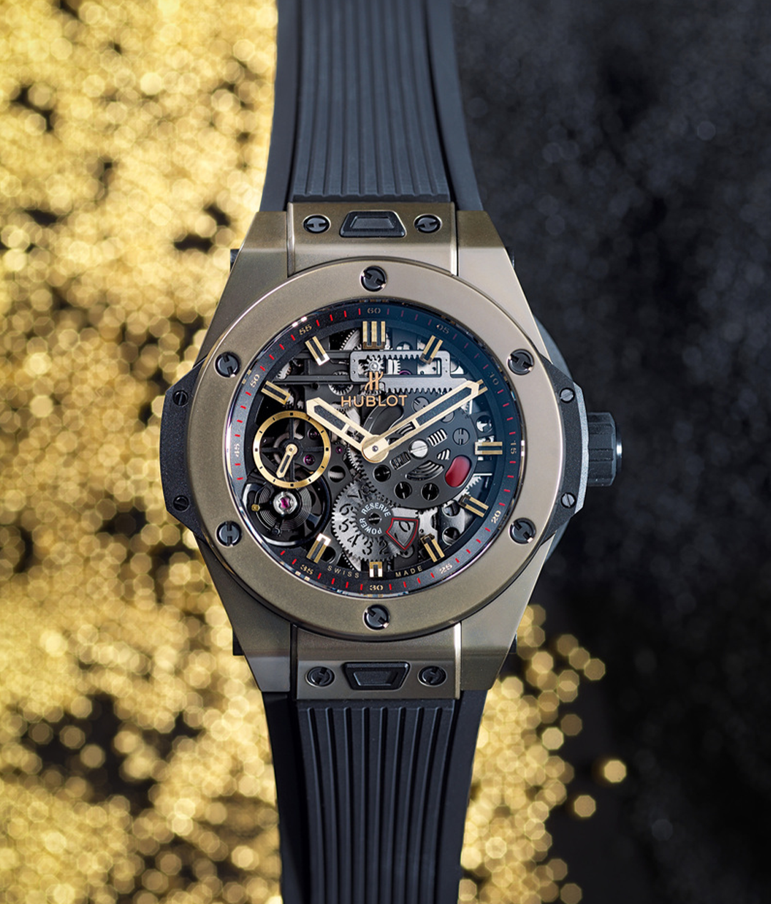Die Big Bang Meca-10 Magic Gold verkörpert Hublots Ansatz, Mechanik als zentrales Gestaltungselement sichtbar zu machen. Ihr eigens entwickeltes Uhrwerk liegt vollständig offen, ein Zifferblatt gibt es nicht. Stattdessen offenbart die Konstruktion aus 79 Teilen ein technisches Schauspiel, das den Charakter der Uhr bestimmt und an die Ästhetik klassischer Meccano-Baukästen erinnert. Die Uhr wurde 2017 mit einem Red Dot: Best of the Best prämiert: „Die Big Bang Meca-10 Magic Gold zeigt, wie viel Freude eine mechanische Armbanduhr bereiten kann. Mit ihr wird ein archetypisches Produkt auf bestechende Weise weiterentwickelt,“ begründete die Red Dot Jury.