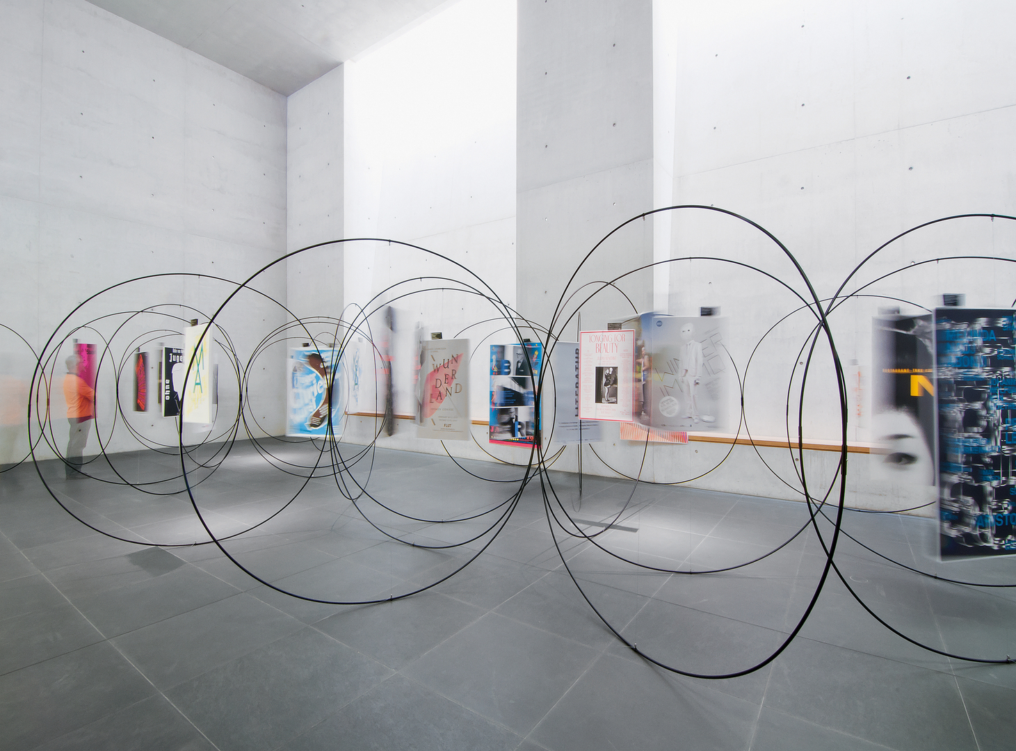 The design of this exhibition system for the presentation of the “100 best posters ’10” corresponds to the corporate design of the award competition. It follows the idea of transforming the competition logo, consisting of 100 concentric circles, into a three-dimensional object. The planar circles are converted into upright rings that chain together like molecules and thus develop into ever-new, complex spatial structures. Since the system is designed on the basis of identical modules, it can be modified into variable configurations at each exhibition venue.