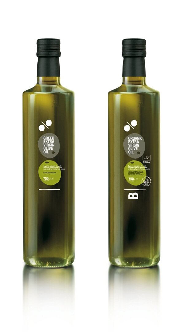 The bottle design of this olive oil takes into consideration the individual steps of the purchasing process. First, the preciously formed glass bottle catches the customer’s eye. Playing a crucial role in the ensuing inspection of the product are the two texts, for they provide information about the quality of the olive oil. The typography, in either white or black, is printed onto colourful areas which demonstrate the contours of a black and a green olive. Read vertically, the design elements form the quality label “100%”.