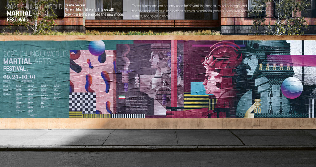 Famous generals and kings of the participating countries adorn the flyers, posters, banners, invitations and other marketing material of the Chungju World Martial Arts Festival in Korea. For the event, two different types of illustrations were created. They produce a coherent overall image and combine martial arts, traditions and a variety of cultures. Some of the motifs use predominantly geometric shapes, graphic patterns and bright colours on a black background. The colours and traditional shapes of the participating countries determine the style of the other illustrations.