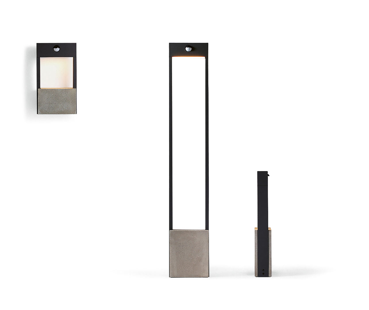 Eine geometrische Linienführung kenn-zeichnet die Wand- und Pollerleuchten dieser Outdoor-Leuchtenserie. Ihr Material-mix lässt einen prägnanten Kontrast zwischen dem hellen Betonsockel und dem schwarzen Aluminiumkörper entstehen. Der filigran anmutende Leuchtenkörper wirkt elegant und lenkt den Blick zum Leuchtenkopf. Sämtliche Leuchten dieser Serie können bei Bedarf mit einem Bewegungsmelder ausgestattet werden.