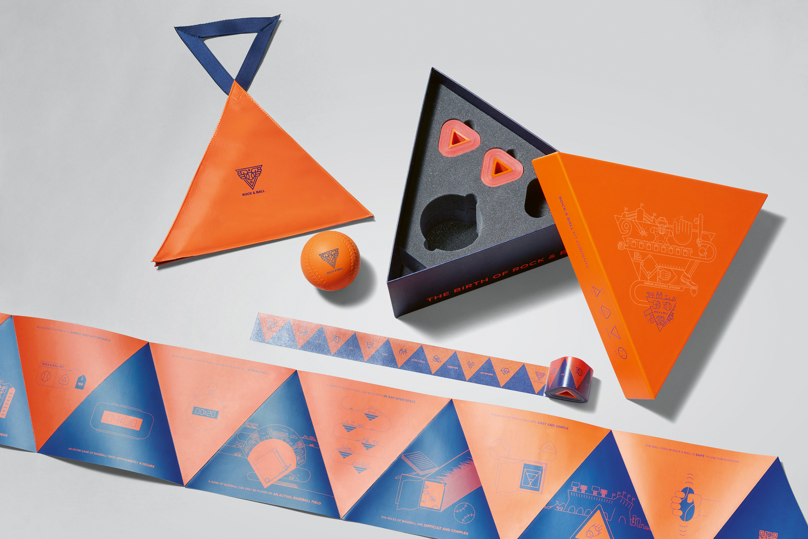 Inspired by baseball, a sport that requires a proper playing field, this three-on-three street baseball game called Rock & Ball was created. It is a new kind of game that can be played on a much smaller scale. The brand design provides a clear reference to baseball through the choice of colours, with the signal colour orange ensuring good visibility both indoors and outdoors. The triangular graphic element of the logo was derived from the number of players on a team and places the ball in the centre of attention. The implementation of the design includes a play kit which, like the logo, features a triangular shape and contains detailed instructions on how to play the game.
