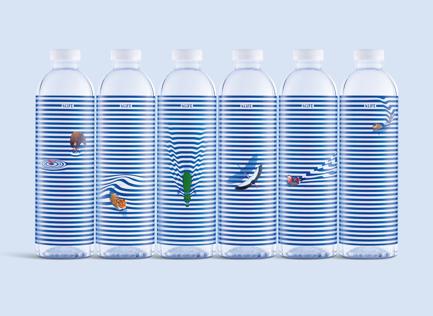 The design of these water bottles shows colourful illustrations of creatures that live in or near the water, which is depicted using blue and white stripes. It plays with the beauty of the movements of waves, which exude a certain degree of fascination. For example, the flamingo flies over the water and casts a shadow. The tiger swims and the crocodile crawls through the water, with the different movements reflected by differing wavy lines. The images are a reminder that water serves to preserve all life and therefore needs to be protected – just like the source from which the water for this beverage brand comes.