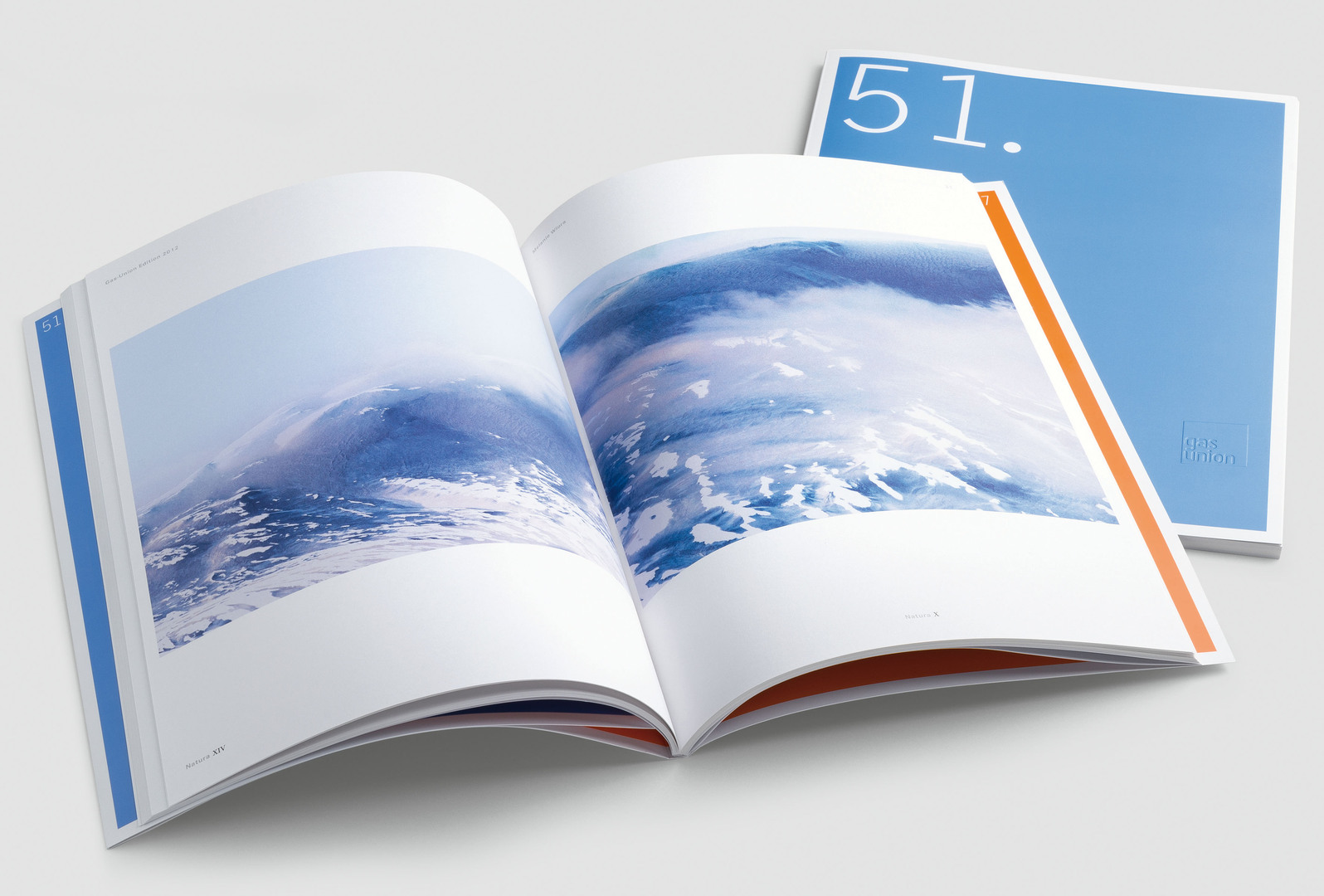 Gas-Union is an enterprise with a clear commitment to the sustainable use of natural resources. This is reflected in the company’s annual reports. Each year, the editions present photographic studies of the impact that mankind has on our natural environment. The 51st report contains works by the artist Melanie Wiora. Only upon closer inspection does the viewer notice that the seemingly magic scenes are in fact the product of image editing. The aesthetic symbiosis of nature and technology occurs in the production of the report itself, in which two different types of paper – coated and uncoated – are used to separate its sections.