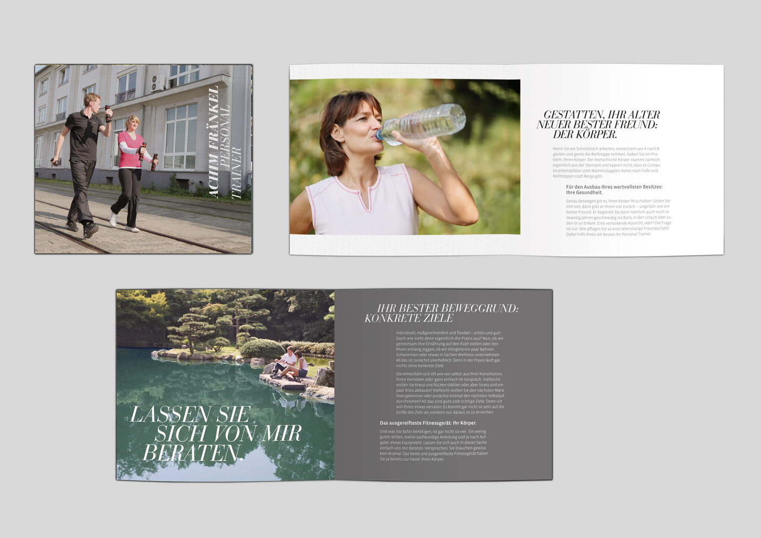 This corporate design positions the personal trainer Achim Fränkel where his financially strong target group feels at home. The logo’s typographical reference to the world of fashion in combination with a contemporary image and video language links it to the sports and lifestyle scene. The business cards and the brochure are refined by a delicate laser engraving, lending the material a haptic quality reminiscent of high-tech sportswear. For the website, this idea was adapted in the form of a subtle graphic pattern.