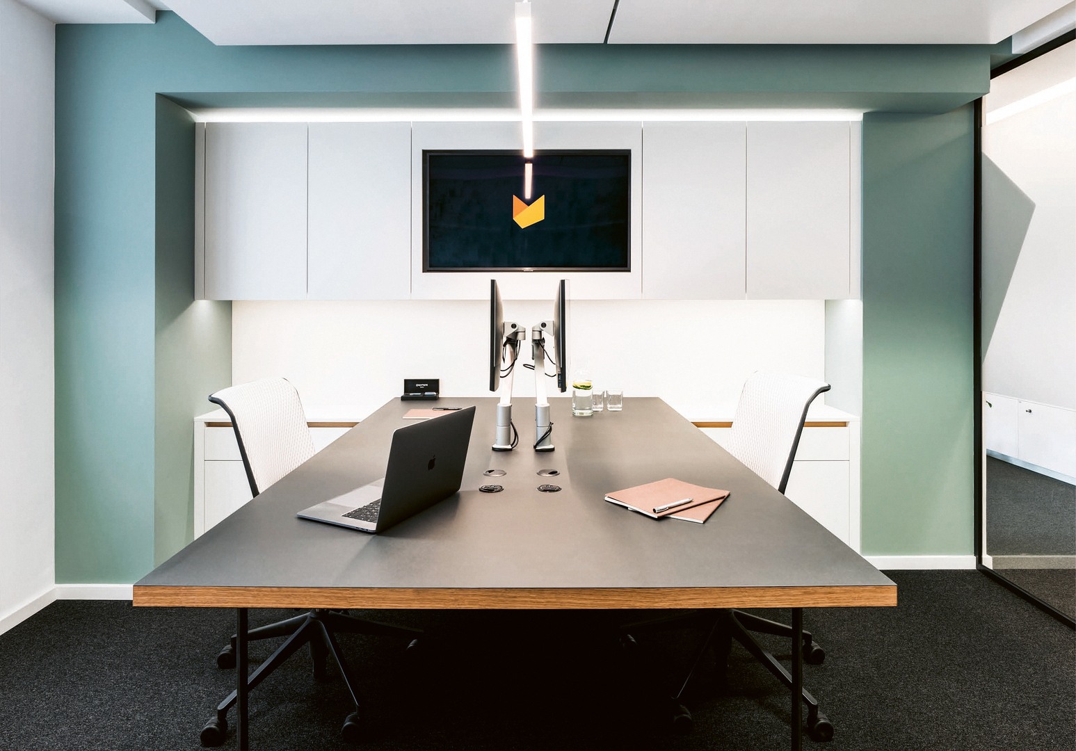 The office design for adabay, a Munich-based digital media agency, welcomes guests with lush, floral patterns into the reception area, giving them a taste of the stylistic fusion awaiting them inside: a monochrome ball pit, a sci-fi room with an interactive flat-screen table, and a jungle room filled with hammocks and wooden stumps. A wall of plants enhances the hall to the large kitchen with pop art accents. The wide range of environments allows the agency to accommodate clients where they feel most comfortable, while keeping their own team inspired in unique co-working spaces. An open-plan office, a conference room full of the latest technology, and the managing director’s office with a fun accent wall of old circuit boards give the second floor a more traditional office flair.