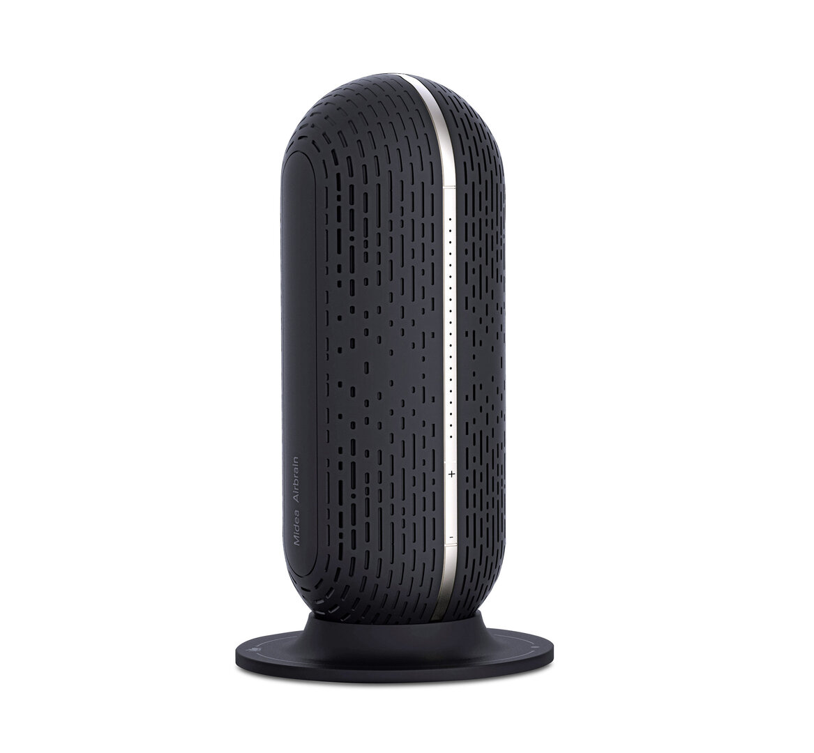 AirBrain ist eine intelligente Steuerzentrale für das Raumklima im Haushalt. Per Sprachsteuerung werden Geräte wie Klimaanlagen, Ventilatoren, Luftwäscher oder Luftentfeuchter bedient. Zudem ermöglicht sie die 2-Wege-Kommunikation und wird dank des 360-Grad-Lautsprechers zur Musikanlage. Als spielerisches Detail besitzt sie eine LED-Leuchte auf dem vertikalen Aluminiumring, die ihre Farbe je nach Sprachlautstärke wechselt.