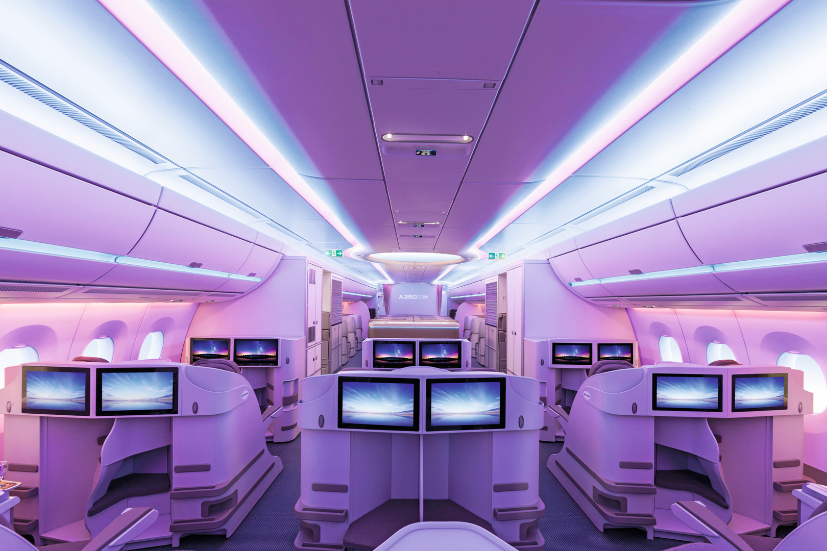 Die Gestaltung der Passagierkabine des Airbus A350 XWB brilliert durch Raumeffizienz und psychologische Finesse. Sie fasziniert mit Details wie einer dezenten Farbgestaltung oder besonders großzügigen Gepäckfächern. Durch die stringente parallele Linienführung bis zum sichtbaren Horizont wird dem Fluggast der Eindruck von Weite vermittelt. Das Innere wirkt derart großzügig bemessen, dass keinerlei Gefühle von Enge entstehen.