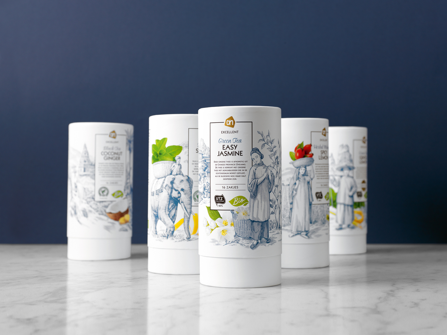 The packaging design for a new range of high-quality organic teas for the retailer Albert Heijn probes the boundaries within the existing grid of AH Excellent products. A new form was developed that would stand out on the shelf, while also reflecting the aspect of sustainability. Furthermore, the design was guided by the idea of integrating the customs of international tea culture, as for instance reflected by the Silk Route. This resulted in an authentic and original design that tells relevant stories. The visual language is derived from antique Oriental blue-white tea sets with their beautiful ornamentation.