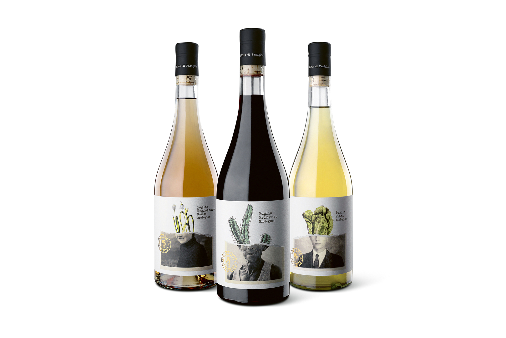 The label design of these three genuine, organic wines from Apulia is reminiscent of the lasting and unbreakable connection each individual has with their own roots. It creates an association with a family photo album, called “Album di Famiglia” in Italian, which tells the stories of different individuals and their special moments. Each label shows the bottom half of an authentic portrait photograph like those taken by the early 20th-century pioneers with a wooden view camera on a tripod. The photo is completed with the illustration of a plant which grows out of the portrait as if it grew out of a root.