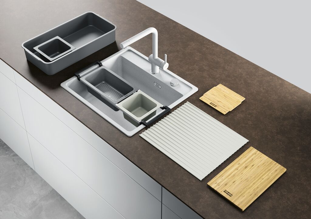 ALL-IN ist ein flexibel einsetzbares Zubehörset für die Küchenspüle. Das Produkt verfügt über ausziehbare Edelstahlschienen, die sich für Spülen mit einem Innenmaß von bis zu 54 cm eignen. Je nach Bedarf können unterschiedliche Zubehörteile wie Schneidbretter, Abtropfschalen oder ein faltbares Pad in die Schienen eingehängt werden. Sämtliche Komponenten sind optimal aufeinander abgestimmt und machen die Spüle zu einem multifunktionalen Arbeitsplatz.