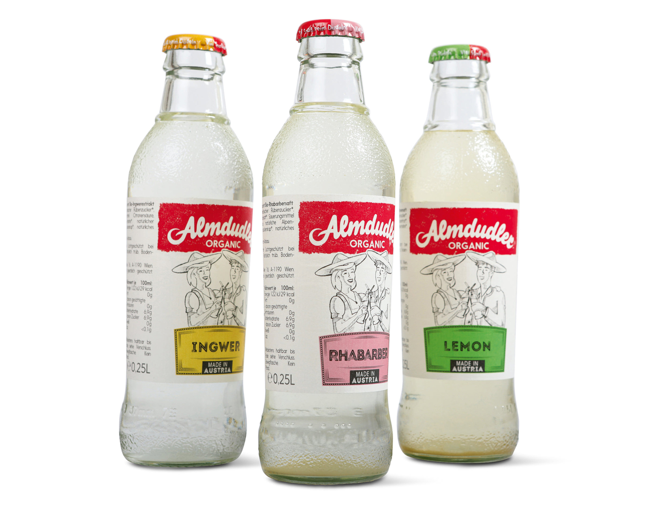 For the brand’s 60th birthday, Almdudler launched three new organic flavours on the market in 2017, with the aim of establishing itself in the fashionable gastronomy segment. With a clear positioning of the products and a distinct visual differentiation from the conventional range, naturalness and craftsmanship became the focus of the label design. The couple dressed in traditional costumes is depicted in a line drawing. The handmade look is further supported by the bottle’s characteristic contours and haptically appealing surface structure.