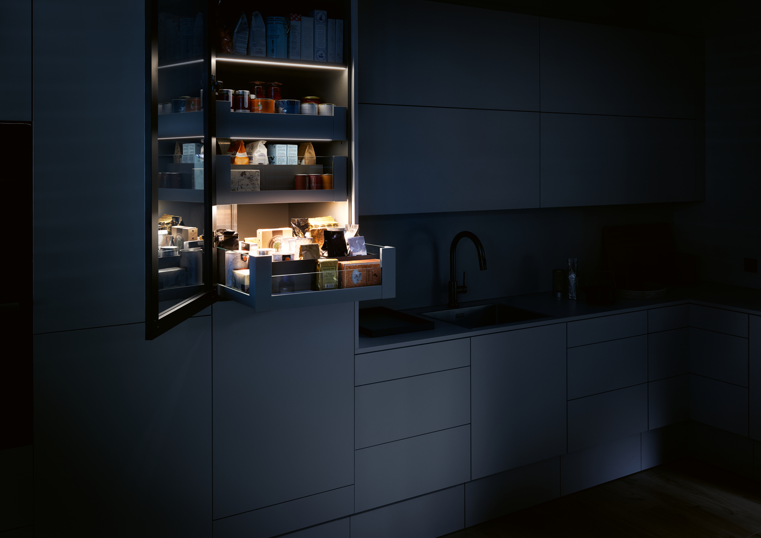 „Wir glauben, dass Möbel in Zukunft viele intelligente Anwendungen beherbergen werden“, lautet das Credo des Möbelbeschläge-Herstellers Julius Blum. Deshalb gewinnt neben der Entwicklung von Klappen-, Scharnier-, Auszug- und Pocketsystemen für Möbel, für die das österreichische Unternehmen bekannt ist, insbesondere die Elektrifizierung von Möbeln und Möbelelementen an Bedeutung. Mit AMPEROS stellt das Unternehmen eine innovative Lösung hierfür vor. Strom wird dabei sicher und ohne frei hängende Kabel in Schubkästen oder Tablarauszügen geführt. Montage und Inbetriebnahme sind einfach gestaltet und erfordern keine Expertise in der Elektroinstallation. So werden Licht- und Ladefunktion sowie die Verwendung von elektrischen Geräten in und auf beweglichen Möbelteilen auf unkomplizierte Weise möglich. Blum bietet dafür zwei Varianten: AMPEROS AC ist eine 230-Volt-Einzellösung, die sich mit verschiedenen hauseigenen Auszugsystemen kombinieren lässt und ohne zusätzlichen Platzbedarf auch nachträglich eingebaut werden kann. Da sie keine Rückwand benötigt, ist sie besonders für Tablarauszüge geeignet, um etwa Kaffeevollautomaten, Drucker oder andere Geräte freier zu platzieren und mit Strom zu versorgen. AMPEROS DC wiederum ist eine durchdachte 24-Volt-Infrastruktur, mit der ganze Unterschränke elektrifiziert werden. Die Lösung bringt Licht sowie Lademöglichkeiten mittels USB-C-Anschlüsse in Schubladen. Diese können dank einer Stromschiene an der Rückseite des Korpus einfach ein- und ausgehängt werden, ohne dass Kabel gelöst werden müssen. Eine Vielzahl akkubetriebener Geräte können so ordentlich aufbewahrt und gleichzeitig geladen werden. USB-Ports und Beleuchtung sind mittels App aktivier- und steuerbar. „AMPEROS vereint schlüssiges Design mit hoher Funktionalität“, zeigte sich die Jury angetan. Und weiter: „Von der einfachen Installation über die geschickte Kabelführung bis hin zum Angebot von mehr Ordnung und Übersichtlichkeit – es ist eine saubere und durchdachte Lösung, die die Wohnqualität erhöht.“ Dabei stünde auch außer Frage, dass AMPEROS nicht nur das Ende des berüchtigten Kabelsalats bedeute, sondern als zukunftsfähige, extern steuerbare Schnittstelle viele weitere Möglichkeiten eröffne.