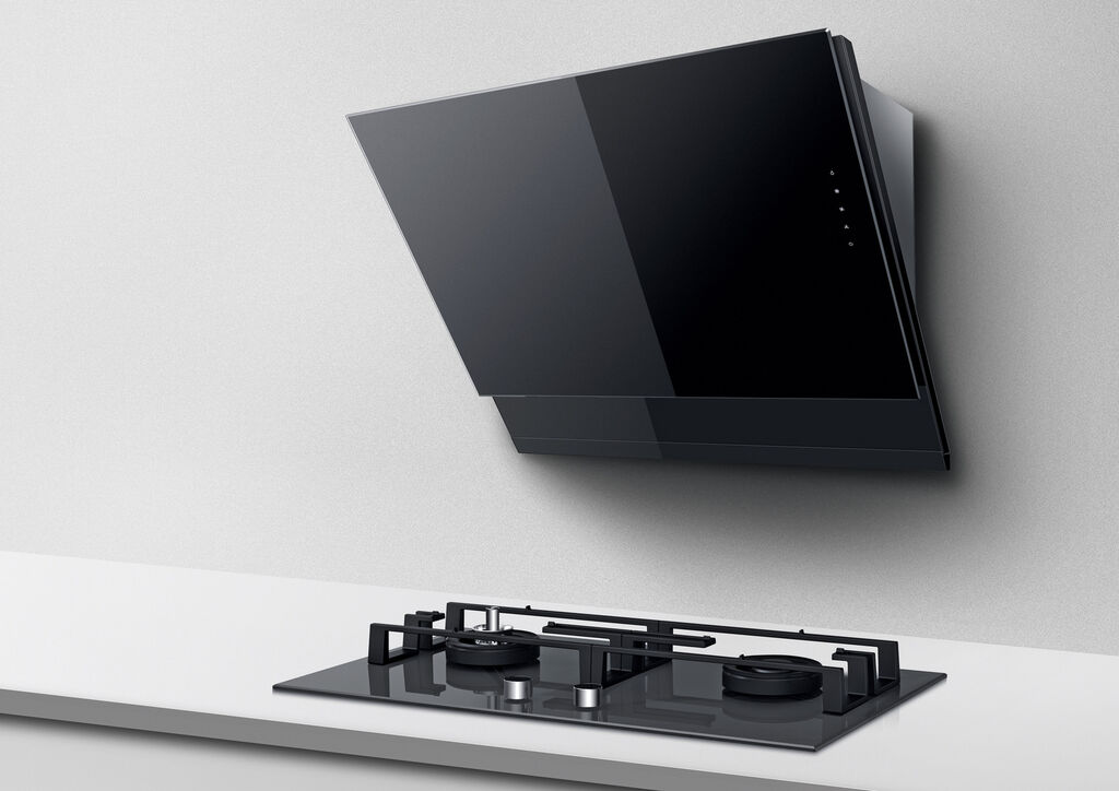 Bei dieser Produktkombination wird die Materialwahl zum verbindenden Element: Sowohl die Dunstabzugshaube als auch das dazu passende Gaskochfeld werden aus schwarzem Glas und einer Aluminiumlegierung gefertigt. Die Glasstruktur verleiht den schmal konstruierten Produkten eine charakteristische Ästhetik. Das rechteckige Kochfeld ist mit einer Touch-Bedienung inklusive einer Zeituhr-Funktion ausgestattet. Das weiße Licht der Drehknöpfe nimmt die Gestaltung der Abzugshaube auf.