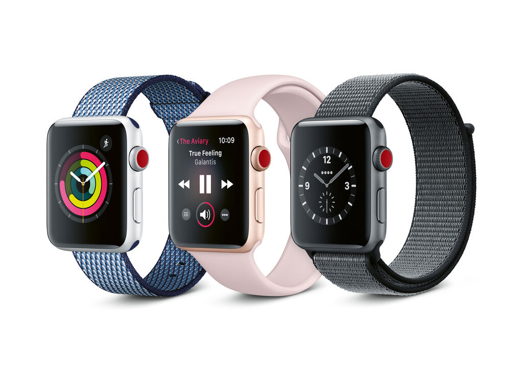 Von der Apple Watch Series 3 werden zwei Varianten angeboten, davon eine mit Cellular-Ausstattung, beide mit besonders leistungsfähigem Doppelkernprozessor sowie einem neuartigen Wi-Fi-Chip. Das Gerät unterstützt Gesundheit und Fitness mit intelligentem Aktivitäts-Tracking, ist wasserbeständig und mit einem Höhenmesser ausgestattet. Die Aluminiumgehäuse werden in den Ausführungen Silber, Space Grau oder Gold angeboten, dazu Bänder in verschiedenen Farben und Stilen. Die Ausführung Gewebtes Nylon etwa zeigt modische Muster, Sport Loop lässt sich mühelos am Handgelenk justieren.