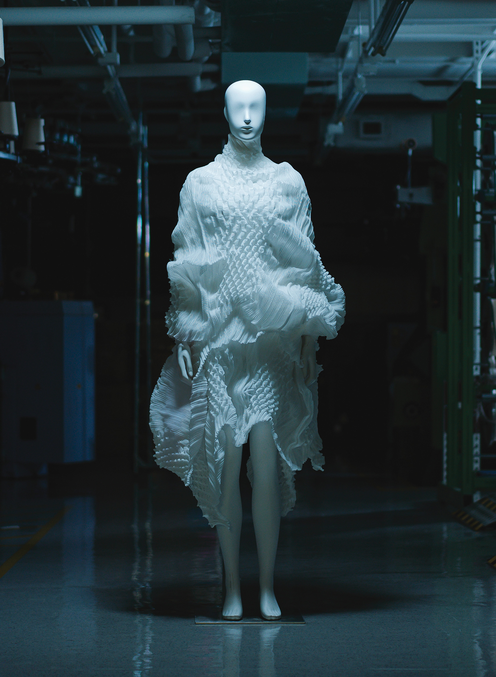 Aqualoop’s distinctive aesthetic uses diverse digital knitting patterns to create a unique 3D texture that responds to the body’s contour, creating a dynamic interplay between clothing and wearer. The transformative construction of this adaptive fabric provides opportunities for different styles and outfits with minor adjustments. The zero-waste manufacturing process utilises all fabric, and the streamlined production advances adaptable, eco-friendly fashion.