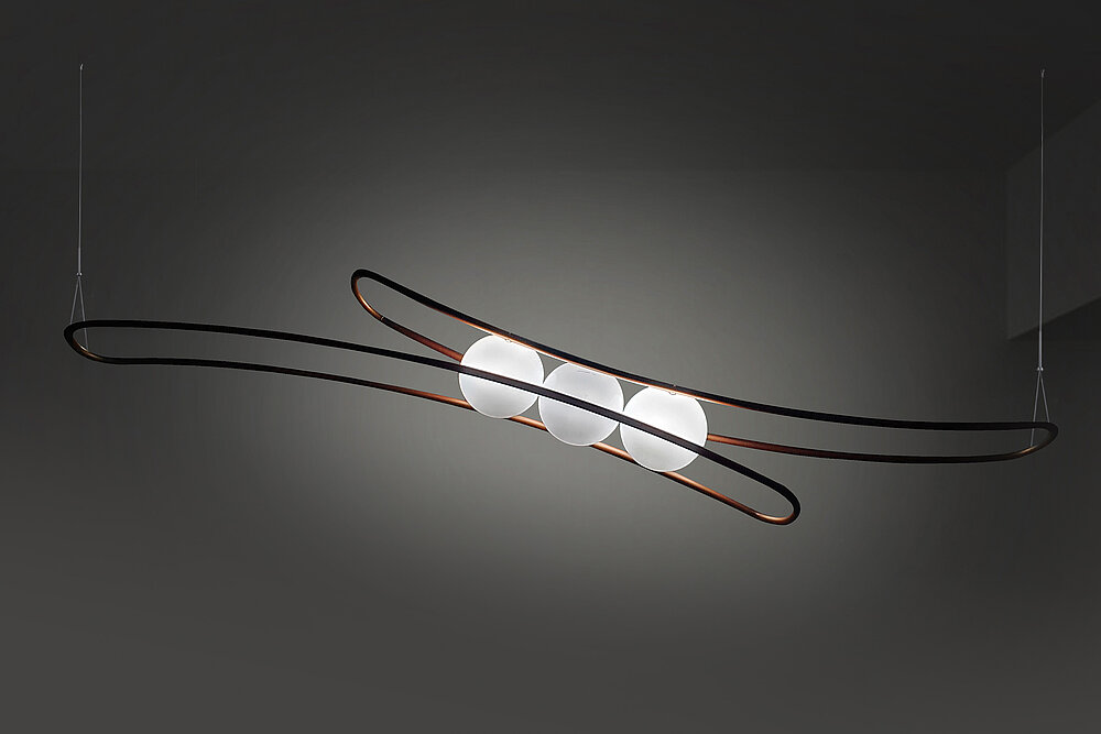 Aria is made of a 1-inch rolled steel tube that is powder-coated in copper and three white acrylic sphere diffusers. Its construction magic is imperceptible to the naked eye — everything happens inside the acrylic spheres. The same structure that holds the lamp together also holds the light source, which consists of three LED 4000K lightbulbs. Suspended by two metal cables, it can be adjusted to any size and easily disassembled for transportation.