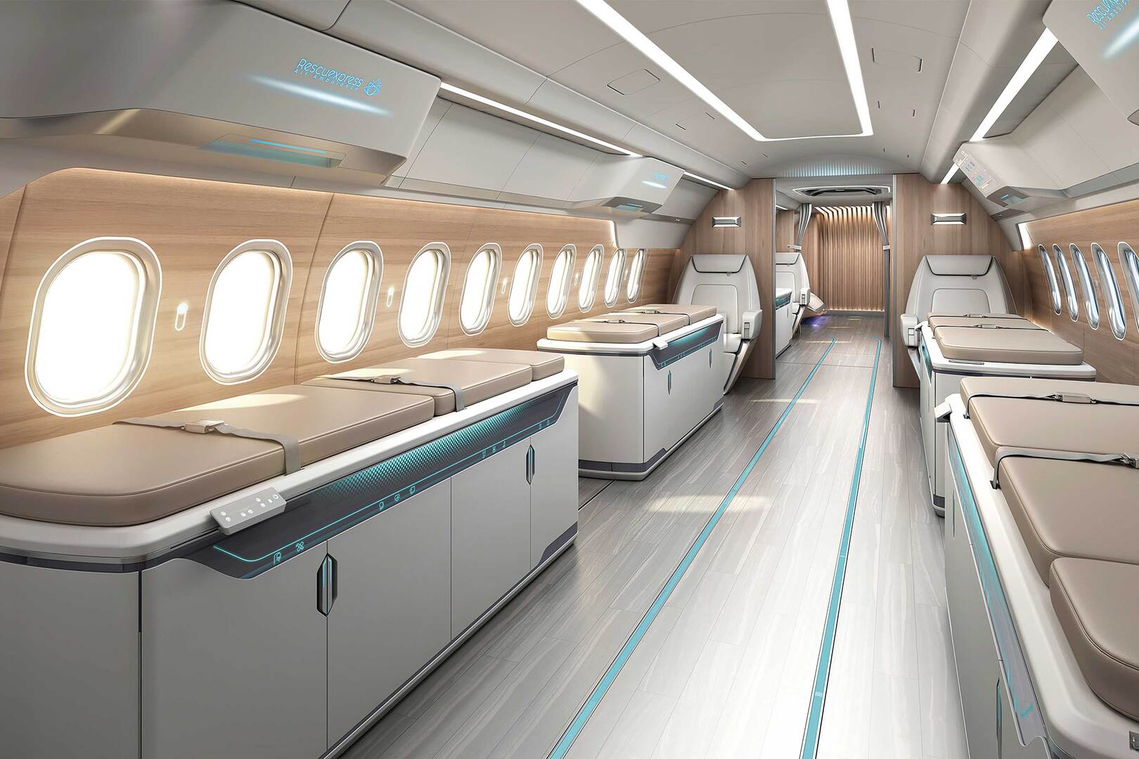 The interior design of the medical jet combines elements of organic grain and high-technology, matching artificial oak material with scientific illumination to create a bright and warm-toned environment. The visual effect of the lighting keeps the patient calm and confident in the professionalism of the rescue. The matte texture adds a delicate touch to the design. The unified linear design visually extends the space, hugely reducing the feeling of clutter and claustrophobia.