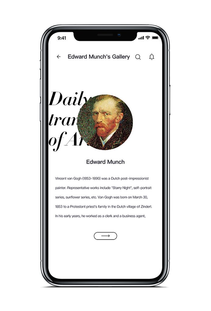 Inspired by online art galleries, this app was developed driven by the idea to make art touchable and comprehensible. Art Today organises the artworks of different painters and enables them to be experienced on mobile phones on a daily basis. Users can discover and explore their favourite works, collect them in their personal gallery and write reviews to engage in discussions around art. An easy-to-access interface improves the efficiency of artwork appreciation. AR and VR features allow users to become active participants and provide the chance to experience art immersively.