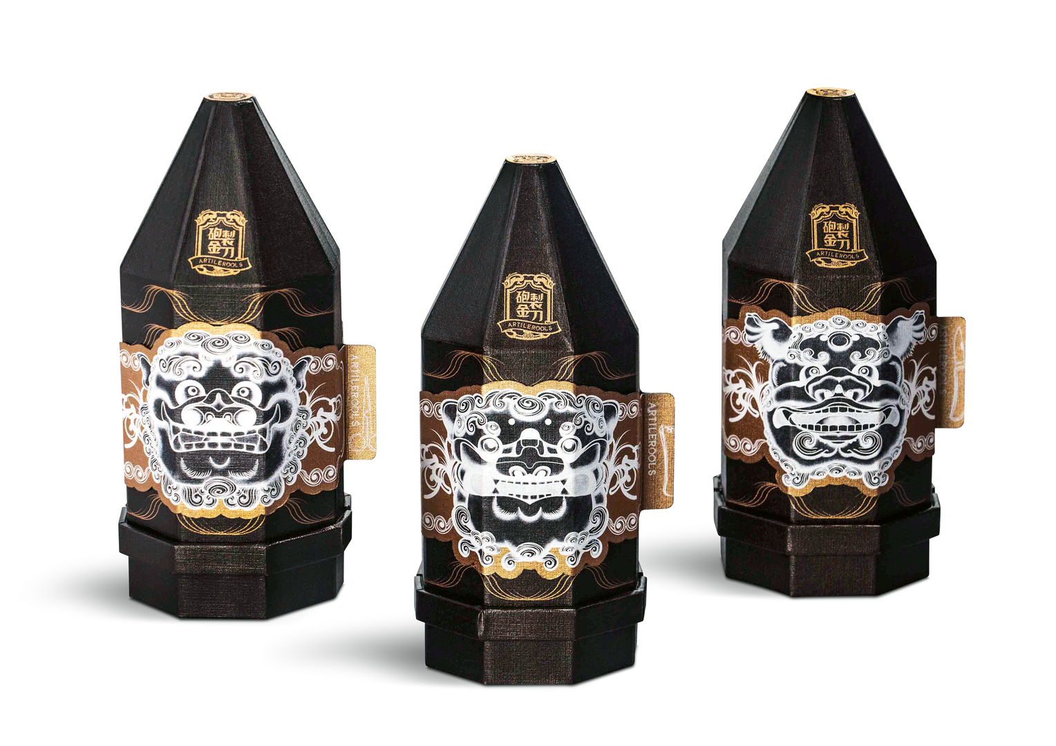Kinmen was the scene of armed conflicts, as evidenced by the left-over shells of millions of grenades. These have been collected, manufactured into knives and other useful items, and sold under the name Artillerools. In this way, the battlefield was to be transformed into a place of peace. The packaging of the utensils features the form of an artillery shell in memory of the original purpose of the metal used. It is decorated with an illustration depicting the Wind Lion God, who is said to protect against misfortune. A booklet with illustrations complements the design.