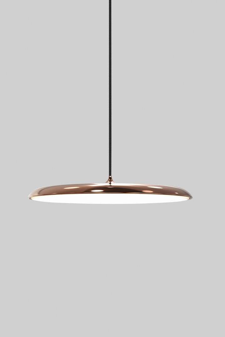 Die darstellende Kunst und ihr Spiel mit der Balance inspirierte die Gestalter zur Kreation dieser Pendelleuchte mit dem Namen Artist. Dank ihrer zart anmutenden Konturen schafft die Leuchte eine besondere Raumatmosphäre – sowohl einzeln als auch in der Gruppe installiert. Der Einsatz eines LED-Paneels, das ein angenehmes Licht in warmem Weiß erzeugt, ermöglichte die Kreation dieses flachen Leuchtkörpers. Die stilvolle Leuchte ist in den drei Ausführungen Kupfer, Grau und Schwarz erhältlich.