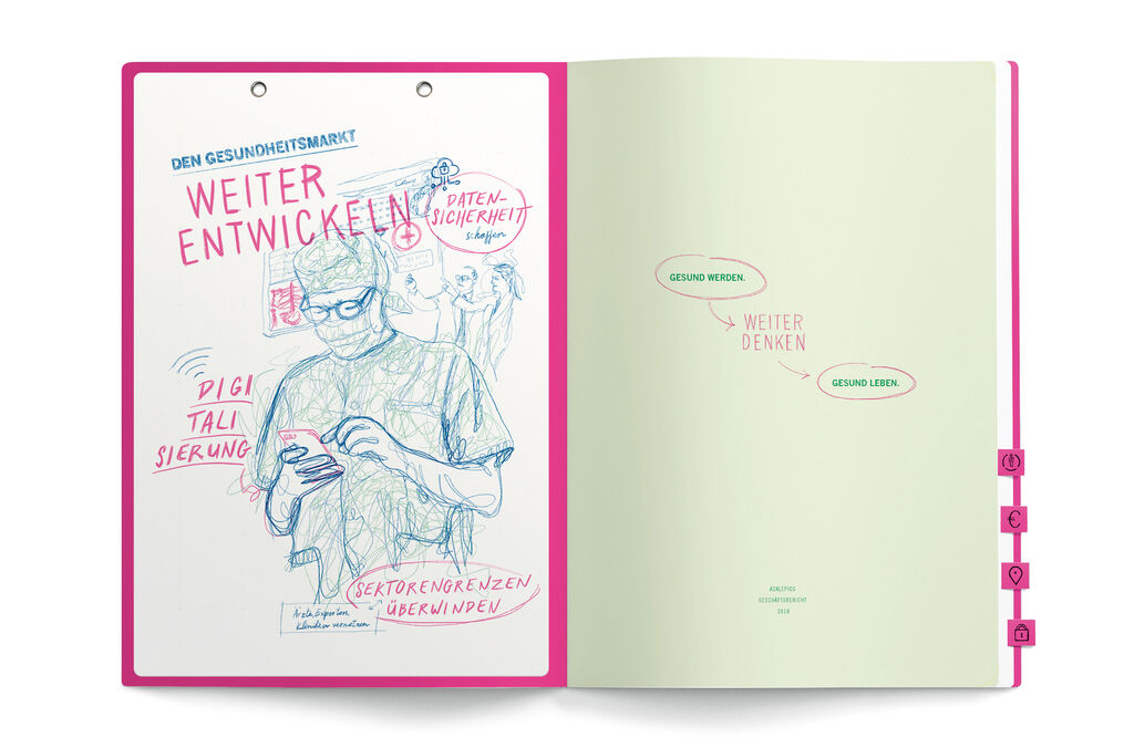 The 2018 annual report of hospitals group Asklepios looks like a notebook and has an unconventional design: hole-punched notes pages, striking neon colours and scribble drawings follow the overall idea with unmistakeable aesthetics. Instead of tabs, sticky notes printed with topic-specific icons denote the individual sections. The creative layout underscores the overarching motto “weiter denken” (think further) and targets readers in a motivating way. The topics are presented with many illustrations, giving the annual report a friendly and casual look.