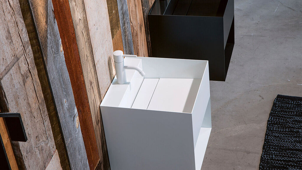 Die geometrisch klare Gestaltung und das nicht alltägliche Material des Waschtischs Asse fallen ins Auge und bringen eine neue Ästhetik in das Badezimmer.