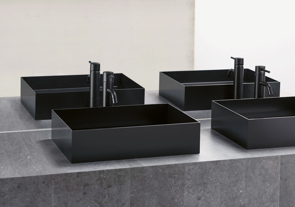 Gerade Linien und Flächen prägen den Waschtisch Asse. In einem speziellen Biegeverfahren werden die dünnen und zugleich stabilen Edelstahlplatten im rechten Winkel gebogen. Sie schließen sich scheinbar nahtlos zu dem puristischen Becken zusammen. Details wie das Abflusssieb sind unsichtbar in den Waschtisch integriert, was die Geschlossenheit der Gestaltung unterstreicht. Die Hybridbeschichtung mit organischer und anorganischer Farbe verleiht dem Material Langlebigkeit.