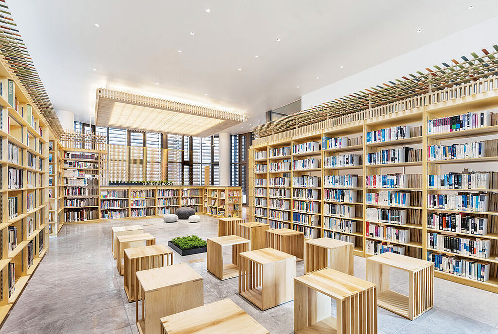 Assembled Void, Library at New York Korea Center in Manhattan verbindet traditionelle koreanische Architektur mit moderner Gestaltung. Die Regale sind im durchbrochenen Rechteck um eine Art Innenhof mit Lesemobiliar gruppiert, was Bewegung und Interaktion begünstigt. Glaswände zum Dachgarten hin verbinden optisch den Innen- und den grünen Außenbereich. Modulare Regale aus Holz, Metall und farbigen Gitterstrukturen interpretieren traditionelle Bauweisen neu. Nachhaltigkeit zeigt sich in der materialeffizienten Bauweise mit einheitlichen Holzstärken.