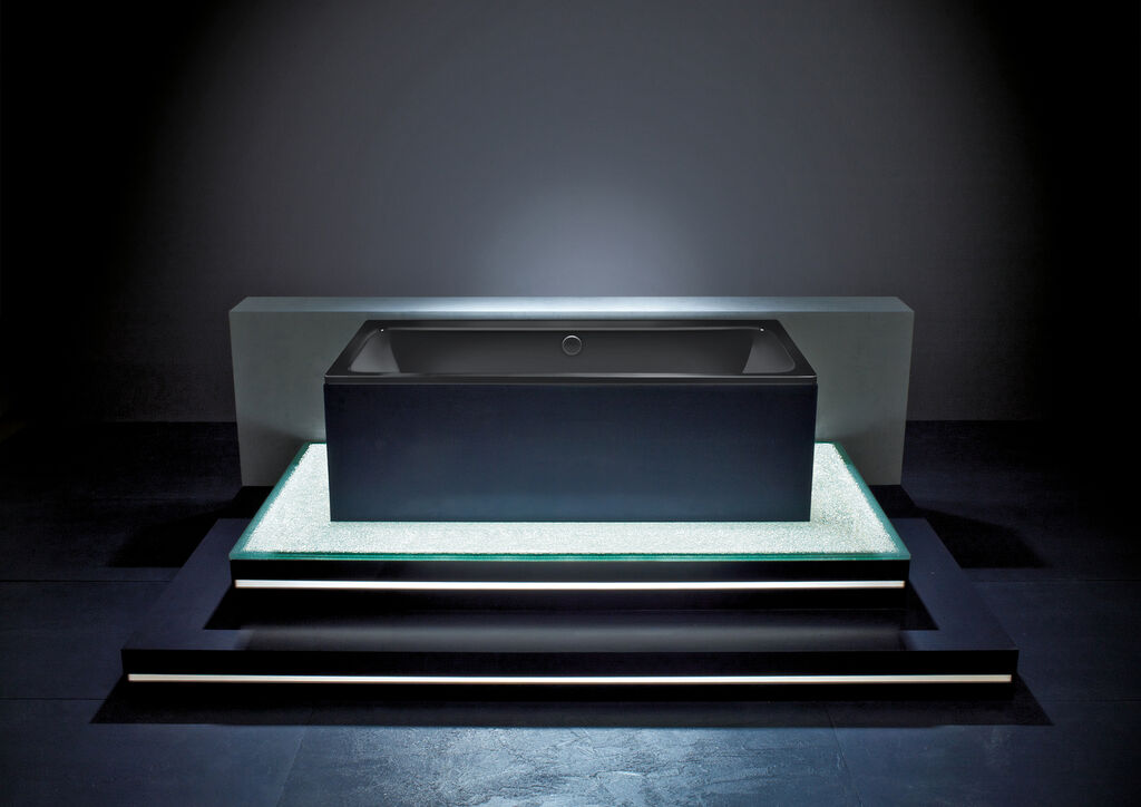 Das markante Gestaltungsdetail eines großzügigen Wannenrandes befriedigt auch das Bedürfnis nach barrierearmen Produkten, da man so bequem im Sitzen mit den Füßen in die Wanne einschwenken kann.