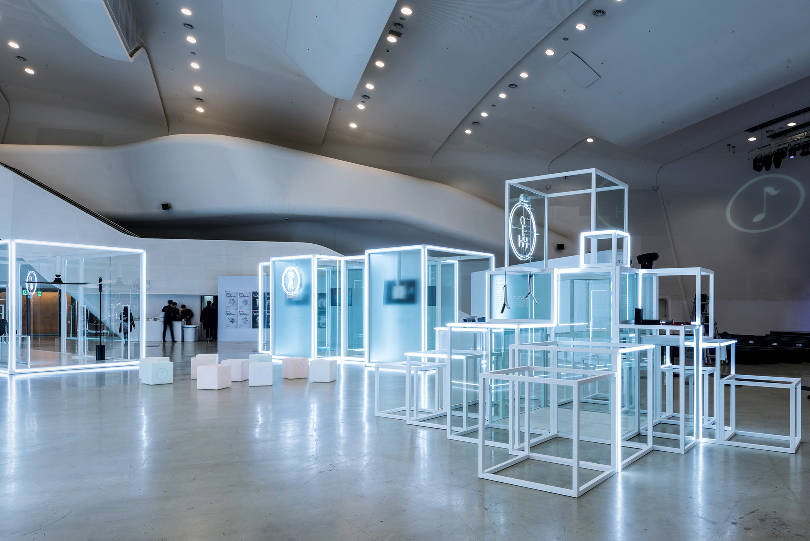 The design of the “Audi Design Challenge 2016” exhibition was based on a differentiated “light” concept that harmoniously integrates the four categories of product, music, motion graphic and furniture. With the aim of showing the spirit of the challenge, the light from headlights of an Audi vehicle was applied to visualise the key message of “lighten the dark to go forward”. This lighting concept was also used in the context of the exhibition itself for the design of the invitations and giveaways. The prizewinning works of the Audi Design Challenge were highlighted on the illuminated stands.