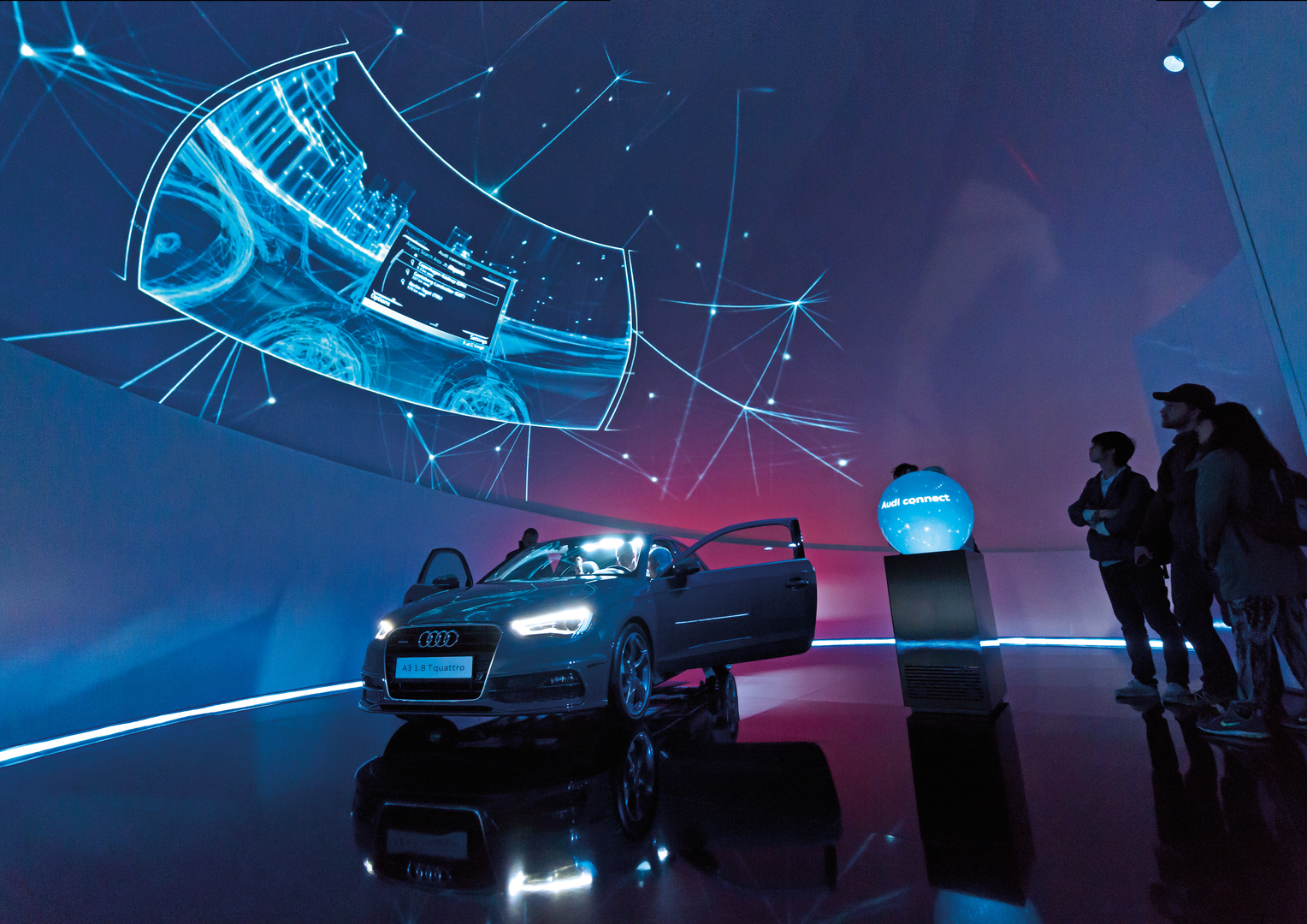 The temporary exhibition “Audi Sphere” in Copenhagen provided insight into the sustainable mobility of the future, with interactive installations that allowed the Audi themes to be experienced playfully. The “Audi e-tron” was visualised through a wind power plant and an e-tron vehicle placed in the middle of the room. For “Audi ultra”, a movable negative scanner revolved around a space frame at the centre of the room, completing the picture of the space frame to create an entire vehicle.