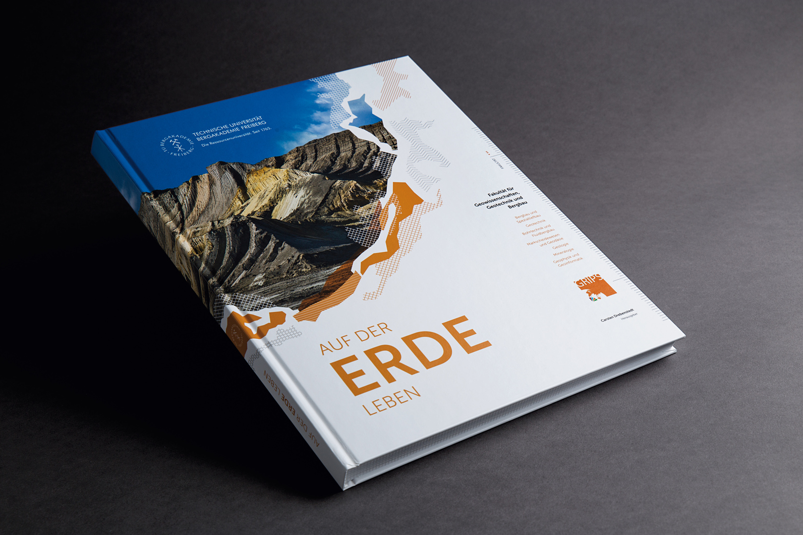 Celebrating the 250th anniversary of the Freiberg University of Mining and Technology, this book pays tribute to the institute’s history and scientific renown. The idea was to enable readers to immerse themselves in the world of geology and to pique interest for this field of study. The design creates a coherent overall concept from a multitude of different individual papers and supports this with high-quality images. Abstract geological maps are used as a graphical element throughout to depict the stratification of the earth in an alienated manner. A ruler at the edge of the page represents the connection to scientific work.