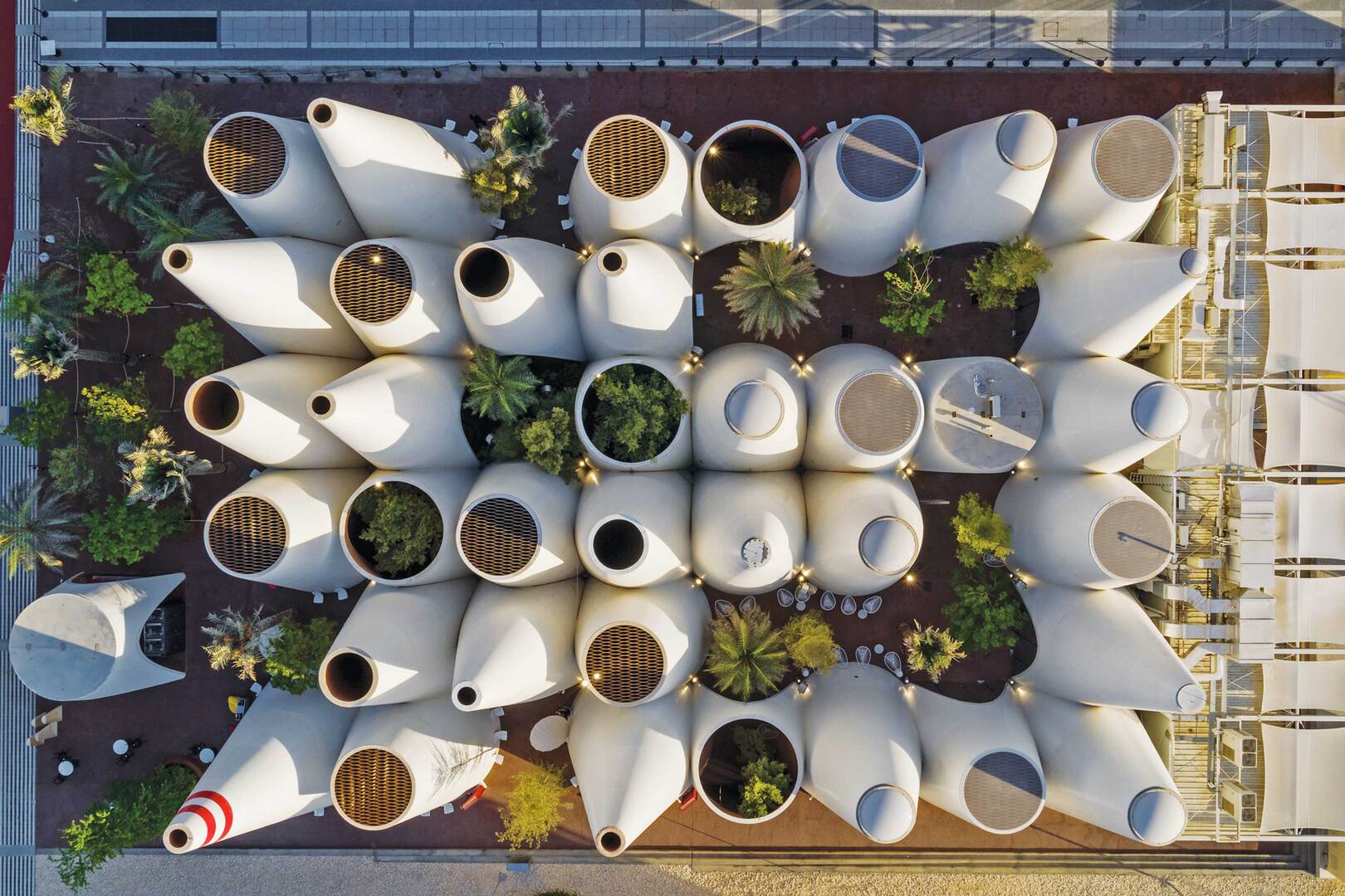 In the general hustle and bustle of the EXPO in Dubai, the Austrian Pavilion stands out as an oasis of calm and relaxation, an experience space that allows visitors to immerse themselves directly in Austria’s most important values by focusing on the essentials. Tradition is translated into modern climate engineering. As a gesture to the host country, the pavilion’s unique architecture is based on a dialogue with Arab building tradition — cones inspired by wind towers — and thus relies on natural air conditioning for the most part. Thanks to careful planning and clay cladding, the construction method uses natural processes to control the temperature of the rooms. During the night, the concrete and clay walls absorb the coolness and release it into the interior during the day. The dialogue between local building traditions and intelligent Austrian climate engineering saves 3/4 of the energy. In addition, planted cones, a densely greened inner courtyard and a water mist system help to naturally regulate the climate. The modular construction of the pavilion is just as future- oriented. Individual cones are made up of only eight different prefabricated parts in an igloo system. This allows the parts to be reused for a long time after the six-month EXPO event, in a completely different composition at a new location, without any structural changes.