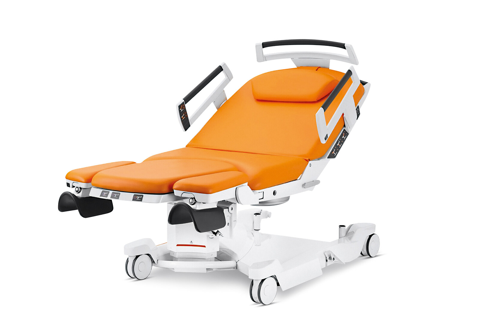 Das Entbindungsbett Ave 2 bietet der werdenden Mutter die Möglichkeit, die angenehmste Geburtsposition zu finden. Über die elektrische Hubsäule kann das Bett für den Einstieg besonders niedrig oder für die ärztliche Intervention besonders hoch eingestellt werden. Die Beinstützen lassen sich manuell über einen Hebe- und Kippmechanismus verstellen, ohne extra abgenommen werden zu müssen. Arzt und Hebamme haben durch den U-förmigen Sitzausschnitt optimalen Zugang zu der Gebärenden. Das Fußteil kann für die Geburt einfach unter das Hauptteil geschwenkt werden.