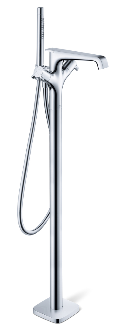 Der bodenstehende Wannenthermostat aus der Kollektion Axor Citterio E verleiht dem Badezimmer klassische Eleganz. Wanne und Mischer präsentieren sich als jeweils allein stehende, edle Einheit. Zwischen Brausehalter und Wanneneinlass wird selbsterklärend per Zugknopf gewechselt. Die Halterung für den Brausestab ist dezent hinter der Wassersäule montiert, dadurch scheint dieser gleichsam zu schweben.