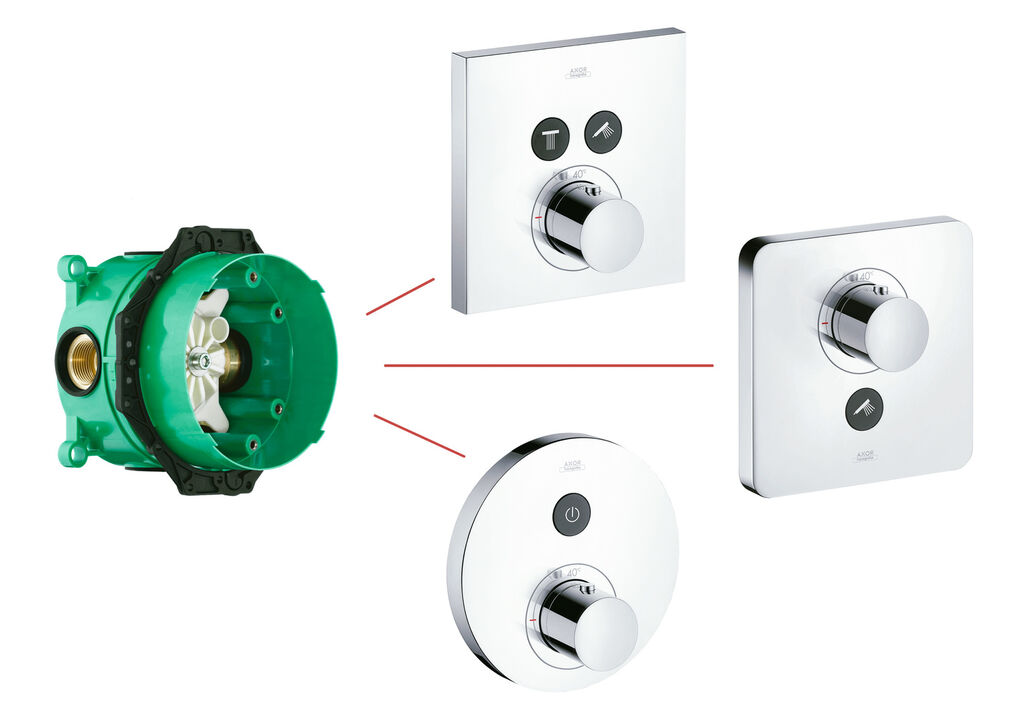 Bei den Thermostaten Axor ShowerSelect wird zwischen Hand- und Kopfbrause durch Tastendruck gewechselt. Von einer bis zu vier Brausearten können angesteuert werden. Leicht erfassbare weiße Symbole auf schwarzem Hintergrund machen intuitives Bedienen möglich. Die Thermostate sind rund, quadratisch oder in sanft abgerundeter Soft-Cube-Form erhältlich. Neben der serienmäßigen Chromoberfläche werden 15 Sonderoberflächen angeboten.