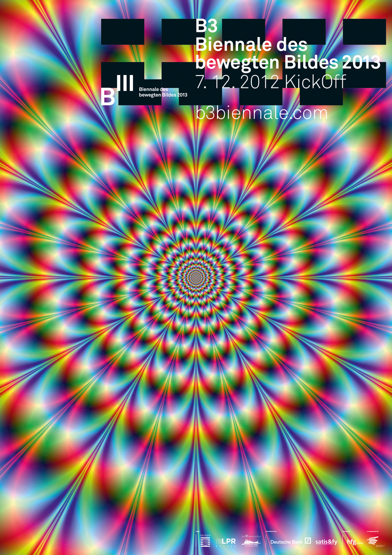 The B3 Moving Image Biennial 2013 takes place in Frankfurt/Main. The organiser is the Offenbach University of Art and Design (HfG Offenbach). The event provides an international platform for film and TV producers, artists, designers, scientists, technology providers, industry professionals and emerging talents. The visual identity of the biennial uses the eye-catching effect of psychedelic images. An artistic, graphic technique creates the illusion of pulsating images that appear to be animated. The motifs are used on advertising posters as well as at the event itself.