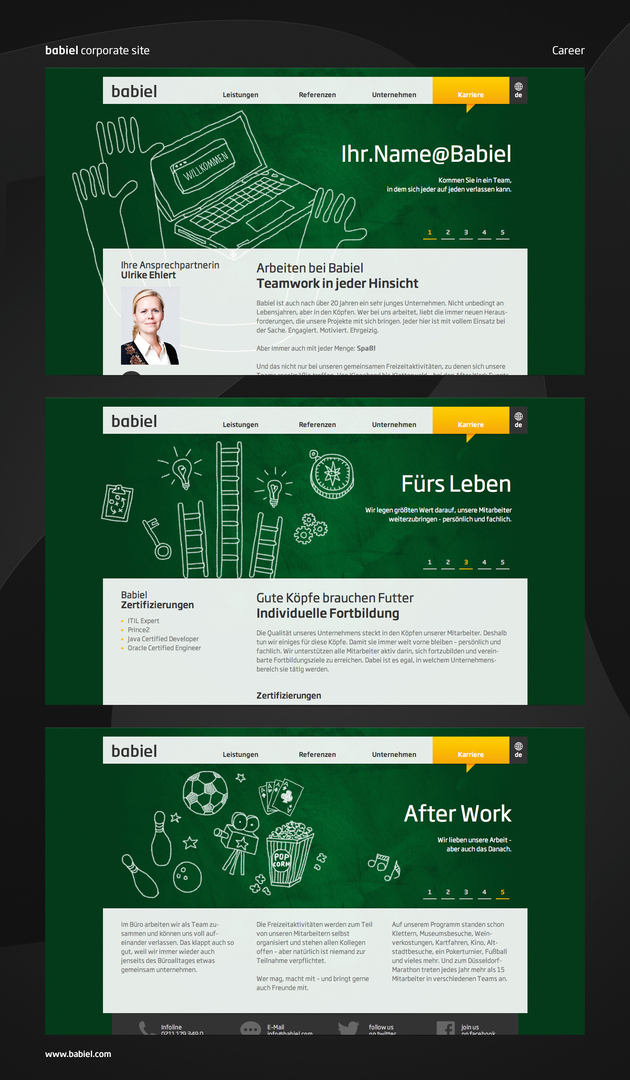 For the repositioning of Babiel GmbH from a classic IT company to a one-stop consulting agency for customer-oriented communication, the new website aims to underscore the company’s core competencies. Alongside a clearly structured overall impression, the website features elegant user guidance that provides customers with quick access to all relevant detailed information after only the second click. Consciously following a no-frills approach, the design is emotionally appealing and easy to navigate.
