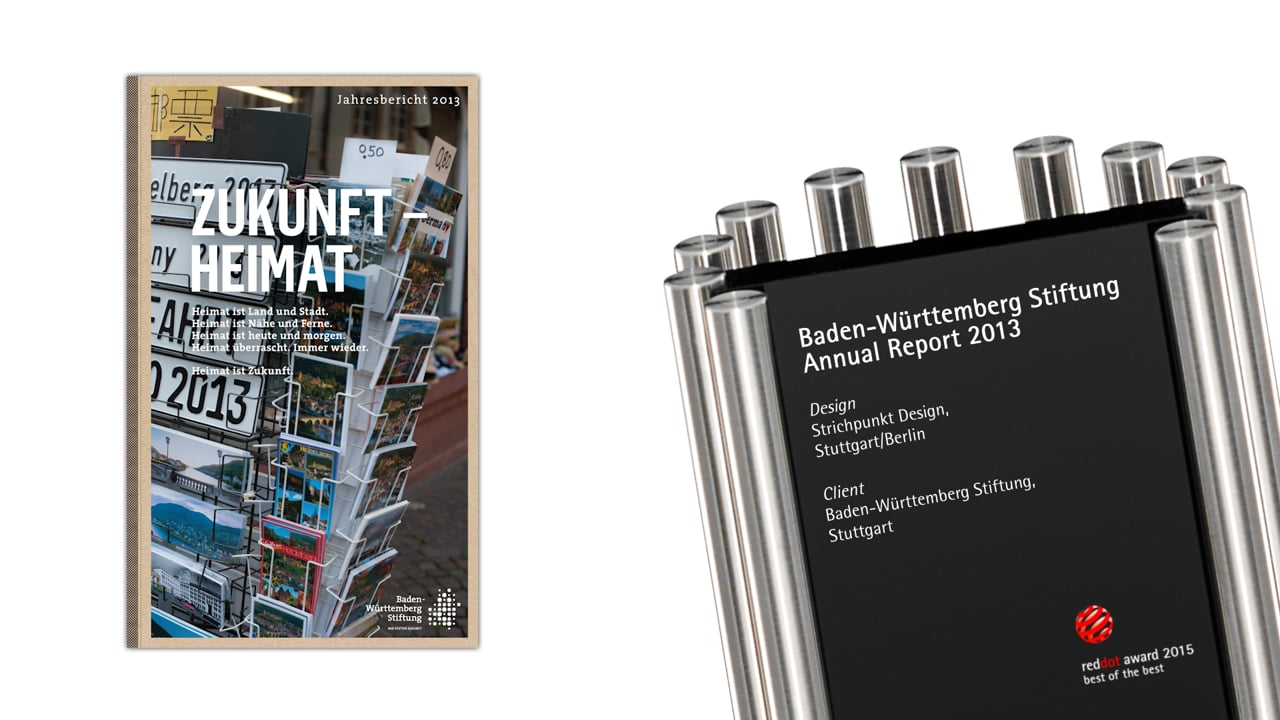 The most outstanding feature of the annual report of the Baden-Württemberg Stiftung is the highly varied and vibrant implementation of content. The theme of “home” is conveyed in a playful manner through the use of different kinds of paper, column widths, foldings, embossings and inserts, as well as an extensive picture series. All those elements contribute to lending the report an additional sensual character that makes reading and leafing through it a pleasure.