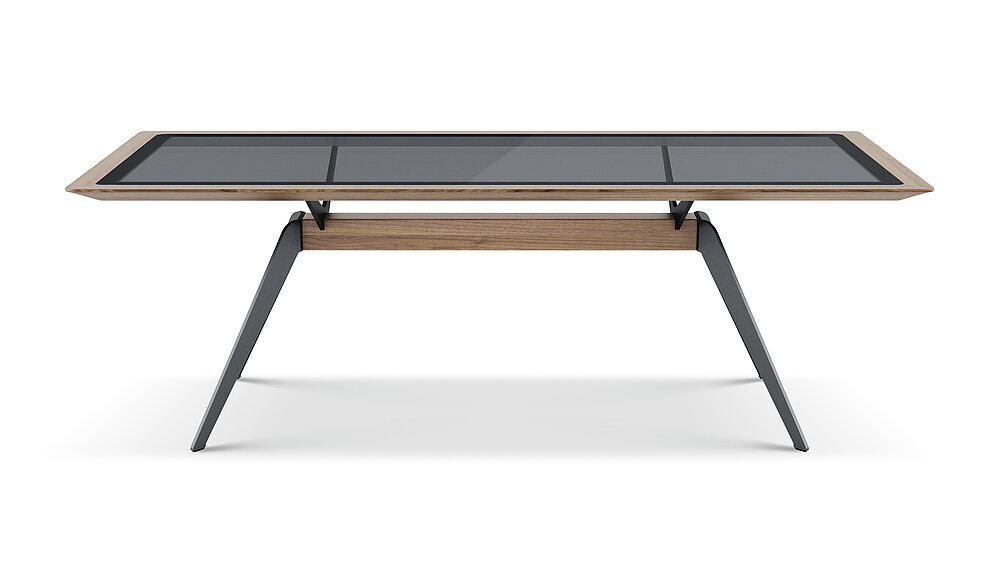 Die anthrazit getönte Glasplatte des Tisches BANDERA ist in einem schützenden, handwerklich gearbeiteten Massivholzrahmen eingebettet. Sie ermöglicht die Sicht auf die raffinierte Unterkonstruktion: Filigrane Metallbügel auf einem eleganten Kreuzfuß aus Stahl tragen sie fast schwebend. Durch die Stahlkonstruktion wird Stabilität auch bei hoher Belastbarkeit erreicht. Dank der Kombination mit natürlichem Massivholz mutet der Tisch warm und wohnlich an. Alle Hölzer sind auf Wasserbasis geölt – so lassen sich leichte Kratzer sogar selbst reparieren.